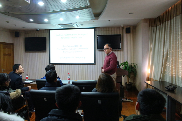 藤原徹教授首先向我们介绍了教授所带团队的研究方向。紧接着介绍了植物整个生长期内所必需的营养元素:碳氢、氧、氮、磷、钾、钙、镁、硫、铁、锰、锌、铜、钼、硼、氯等16种,并结合其实验室的研究进展,藤原徹教授对硼、镁两种元素展开了具体讨论,主要以拟南芥和水稻为研究对象,研究转运硼,镁等营养元素在植物细胞膜上的转运蛋白的功能和转运机制。藤原徹教授在植物营养吸收的研究,对当前实验室水稻抗性研究及壳寡糖吸收机制研究具有很强的指导意义。
