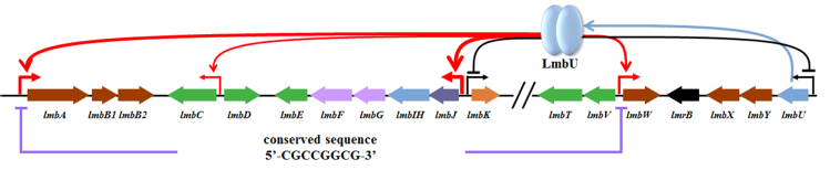 Hou B, Lin Y, Wu H, et al. The novel transcriptional regulator LmbU promotes lincomycin biosynthesis through regulating expression of its target genes in Streptomyces lincolnensis[J]. Journal of Bacteriology, 2018, 200(2): e00447-17.
