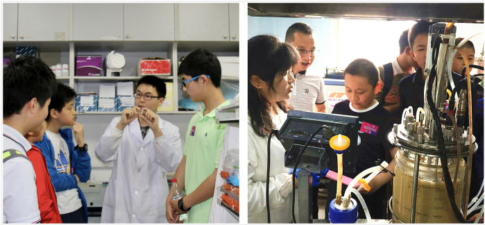 之后的科学体验环节同学们在实验室研究生的带领下现场体验了微生物大规模培养关键步骤—菌种接种的操作,并现场观看了微生物实验室规模发酵演示,随后实验室副主任肖婧凡副教授带领大家参观实验室,并进行了详细的介绍,让同学们了解了智能生物反应器在工业化生产中的应用。