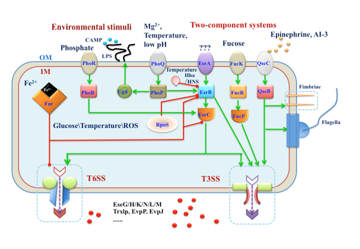 围绕着海水养殖业主要病害,beat365官网相关课题组紧扣“病原菌如何感知水产养殖环境和鱼类宿主生理变化并进行条件致病”主题,较为系统研究了相关病原菌感知包括温度、渗透压、pH、盐离子等鱼体内、外多种理化和生理信号变化并协调其中主要毒力系统T3SS和T6SS等表达和相关效应蛋白分泌的分子机制(图2),基本阐明造成鱼类病害发生的机理,并进行了减毒活疫苗的理性分子设计,相关研究成果发表在《iScience》、《Proceedings of the National Academy of Science of the United State of America》、《PLoS Pathogens》、《mBio》、《Environmental Microbiology》和《Virulence》等主流期刊,并获得多项国家发明专利授权和国家一类新兽药证书,相关疫苗产品也获得产业化应用,推动了我国海水养殖鱼类免疫防治体系的构建。