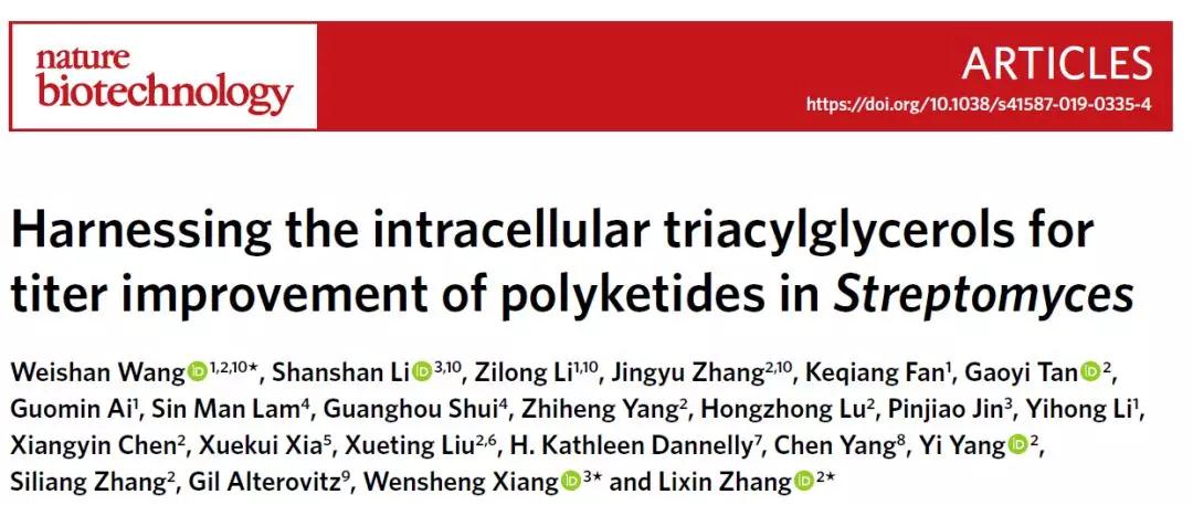 2019年12月9日,beat365官网生物反应器工程国家重点实验室主任张立新教授,联合中国科学院微生物研究所王为善研究员和中国农业科学院植物保护研究所向文胜研究员,在链霉菌胞内三酰甘油(TAGs)降解机理研究中取得突破性进展,在国际权威学术期刊Nature Biotechnology杂志上以长篇论文(article)形式在线发表题为 “Harnessing the intracellular triacylglycerols for titer improvement of polyketides in Streptomyces” 的文章。