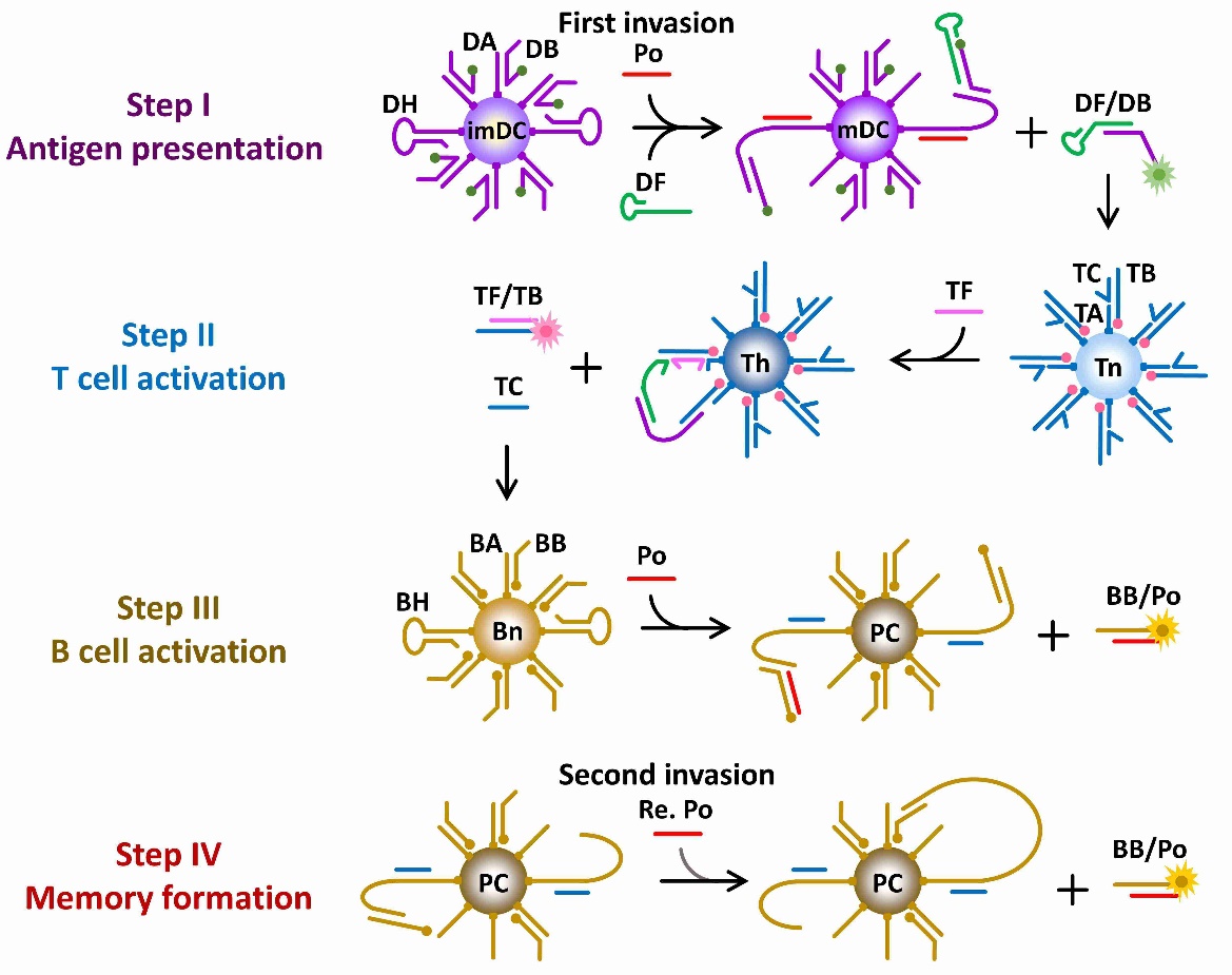 beat365平台唯一官网生物反应器工程国家重点实验室叶邦策教授课题组通过模块化设计DNA分子机器,开发了一种多DNA机器交互网络系统,成功模拟了脊椎动物获得性免疫系统中细胞与细胞间通讯对病原体的识别,清除以及记忆。通过三种DNA分子机器分别模拟关键免疫细胞:树突状细胞(DC)、T细胞和B细胞,生动地展示了病原体侵袭过程中DC细胞,T淋巴细胞和B淋巴细胞的连续激活、抗体分泌、记忆形成和快速高效的二次应答。