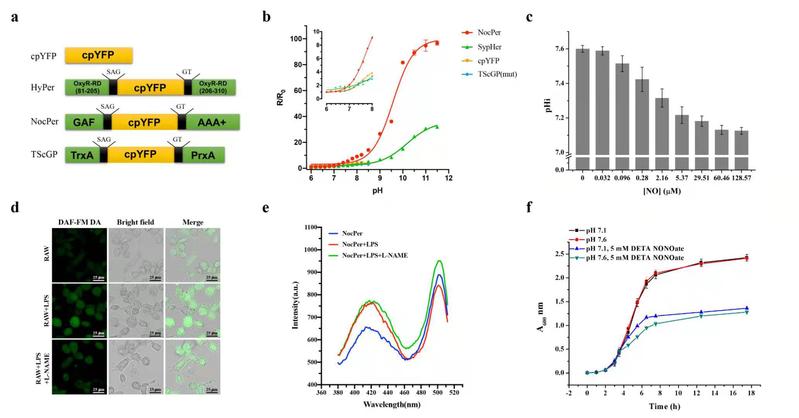 圆排列环状荧光蛋白(cpFP)相较于普通荧光蛋白(FP)展示出更高的pH敏感性,具备检测pH的先天优势,但由于存在荧光峰易迁移、稳定性欠佳,尤其是仅具有单峰,限制了其作为比例型探针的应用潜力。周胜敏课题组在黄色cpFP(cpYFP)分子的碳、氮端分别连接了一氧化氮(NO)感受蛋白NorR的失活突变体蛋白片段(图a),发现该探针虽不能在体外感应NO,但可响应pH的细微变化,且具有双峰,其灵敏度为常用pH探针pHluorin的3倍(图b),因此是一款比例型超灵敏pH探针,命名为NocPer。进一步研究发现,NocPer虽非NO探针,但在大肠杆菌体内却能响应胞外NO的刺激,暗示NO刺激可能激发pHi变化(图c)。最后通过多重实验验证了“NO刺激引起pHi下降”这一假说,并阐述其所涉的机制,NO通过抑制呼吸链复合物III的活性,限制了质子的膜外搬运,引起pHi下降。研究还证实在感染人体过程中,巨噬细胞释放NO(图d),此条件下微生物维持低pHi(图e),是病原菌的一种自我保护策略(图f)。