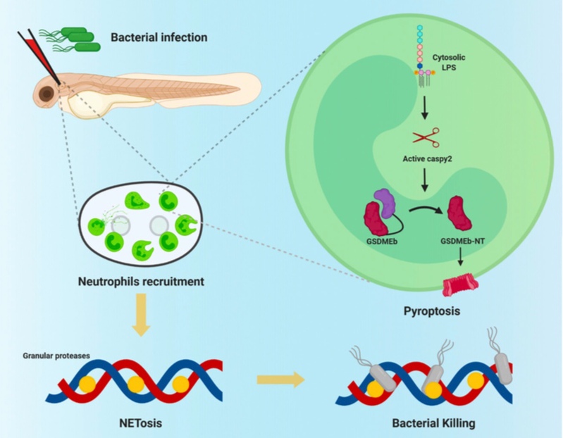 中性粒细胞是血液中的一种白细胞,当机体出现感染或炎症时,中性粒细胞就会聚集在有炎症的地方开始吞噬细胞和细菌,帮助机体抵御感染等疾病的发生。近日,beat365官网beat365平台唯一官网刘琴教授团队在鱼类细胞焦亡调控中性粒细胞胞外陷阱(Neutrophil Extracellular Traps,NETs)发生分子机制方面取得新的进展。3月12日,相关研究成果以“Pyroptosis Mediates Neutrophil Extracellular Trap Formation during Bacterial Infection in Zebrafish”为题,在线发表于美国免疫学会会刊《The Journal of Immunology》。