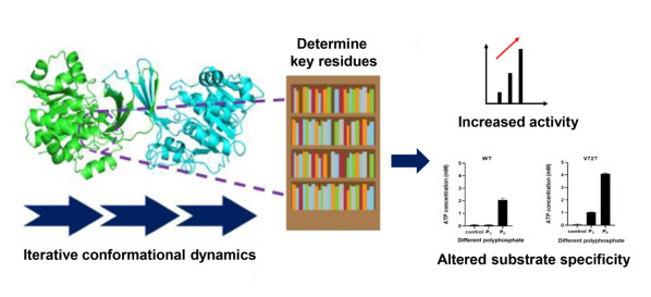 为了证明ICDA的普遍适用性,作者还研究了耦联体系中的多聚磷酸激酶,通过对多聚磷酸激酶执行ICDA分析,快速确定了17个关键残基,并选择其中三个残基(E40、V72和A98)进行饱和突变,得到57个突变体。选择10个均方根波动发生显著变化的多聚磷酸激酶突变体用于全细胞催化实验。结果表明,V72T变体可催化三聚磷酸盐和ADP生成ATP的反应。使用多聚磷酸激酶变体与胞苷激酶变体耦联,不仅提高了胞苷酸的生产效率,而且降低了成本。这些结果有力地支持了ICDA方法的适用性。相关研究结果均已申请专利(专利申请号202110403969.3和202110404992.4)。