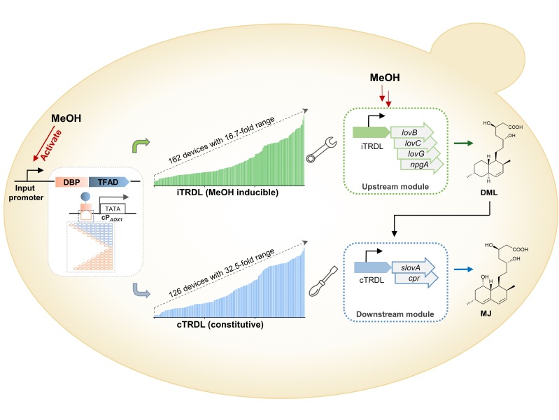 该研究中,作者在前期设计转录增益装置的基础上(Science Advances, 2022, 8:eabl5166),进一步分析毕赤酵母转录调控机制并重构转录调控遗传线路,对不同来源和功能的DNA结合蛋白、结合序列、转录因子激活域等特定功能元件进行组合设计,构建了一套输出强度呈连续变化的组成型人工转录器件库cTRDL,库容量达到126个,强度为商业化毕赤酵母PAOX1的16%~520%,整体差异倍数达到32.5倍。在此基础上,通过筛选合适强度范围的甲醇诱导型启动子作为输入启动子,适配人工转录调控核心组件,进一步构建了一套输出强度呈连续变化的甲醇诱导型人工转录器件库iTRDL,库容量达到162个,强度为PAOX1的30%~500%,整体差异倍数达到16.7倍。理论上,两套具有不同调控模式、输出强度连续变化、强度跨度大的人工转录器件库,可为毕赤酵母中重组蛋白表达和复杂小分子产物合成提供更多可选的工具和更为灵活的调控模式。