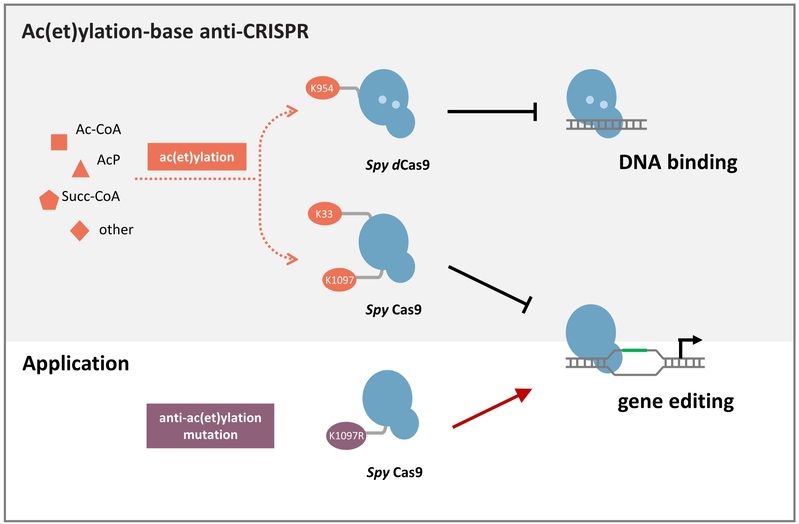 叶教授团队研究发现,外界环境或营养引起的细胞内代谢产物积累(如乙酰磷酸、乙酰辅酶A、琥珀酰辅酶A等)会造成基因编辑元件Cas9蛋白的翻译后(酰基化)修饰(如乙酰化、琥珀酰化),通过位点鉴定和体内体外实验分析证实,K954位点的乙酰化显著抑制SpyCas9蛋白(来自于Streptococcus pyogenes)与靶标DNA的结合,而K33和K1097位点的乙酰化显著抑制SpyCas9蛋白对靶标DNA的切割活性,其中,根据酰基化修饰原理对K1097位点进行突变改造,能够屏蔽酰基化修饰的抑制作用,显著增强Cas9的切割活性,有潜力开发为更加高效的基因编辑工具。此外,研究还发现,除了Cas9蛋白以外,其他Cas蛋白如Cas12a在细胞内受到酰基化修饰并且对其顺式和反式切割活性产生抑制作用,从而表明酰基化修饰对Cas蛋白活性的影响具有普适性。这种代谢波动引起的酰基化修饰会严重影响CRISPR基因编辑效率,因此,在开展CRISPR基因编辑研究中需要考虑了翻译后修饰的影响,建立基于翻译后修饰的Cas酶理性改造及实验设计优化策略。代谢产物驱动的酰基化修饰抑制Cas活性可能具有生物学意义,在细菌与噬菌体相互竞争的进化历史中,噬菌体已进化多种拮抗细菌CRISPR免疫系统的方法,如合成抗CRISPR蛋白(Acr),通过蛋白质互作或蛋白质修饰改变CRISPR-Cas活性,逃避CRISPR免疫系统;该研究成果揭示基于非酶催化的酰基化修饰可能是噬菌体进化的一种与Acr介导机制截然不同的抗CRISPR机制,噬菌体感染导致细胞内代谢变化,代谢产物积累并修饰Cas蛋白,有效逃避细菌CRISPR免疫系统。