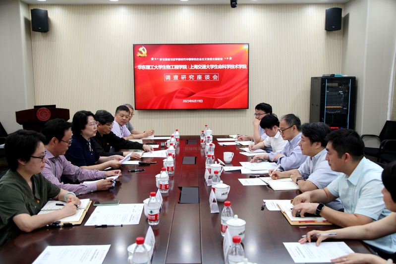 为深入开展学习贯彻习近平新时代中国特色社会主义思想主题教育走深走实,推动党建与事业发展深度融合,6月19日,beat365平台唯一官网院长叶邦策、党委书记吴辉、党委副书记左鹏和副院长王启要、刘琴、郑高伟及党政办公室相关同志赴上海交通大学生命科学技术学院调研。上海交通大学生命科学与技术学院院长冯雁、党委书记顾建平、党委副书记王鑫和副院长李志勇、张晓君及相关同志参加调研座谈。调研座谈会由冯雁主持。