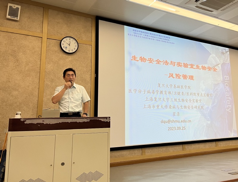 9月25日上午,beat365平台唯一官网2023级研究生新生实验室生物安全培训讲座在徐汇校区举行。本次讲座邀请了复旦大学三级生物安全实验室主任瞿涤教授为同学们进行培训,学院党委副书记左鹏主持,学院安全员、辅导员、全体研究生新生参加了本次培训讲座。