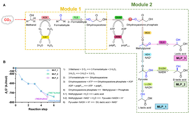 C1原料的生物转化与利用对构建可持续的碳循环经济来说至关重要。近年来,国内外学者以C1化合物为原料,实现了系列化合物的生物合成,例如CO2合成淀粉、丙氨酸、甘氨酸和丙酮等。乳酸是一种重要的平台化合物,在医药、化妆品和食品等领域有广泛的应用。