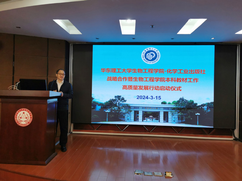 叶邦策首先为全院教师解读学院“本科教材工作高质量发展行动”方案。学院将抓住国家“十四五”规划教材建设契机,统筹规划、精心组织,保质保量完成12本再版教材以及4本新增教材的编写工作,促进学院本科教育教学高质量发展,助力生物工程A+学科建设。接着,叶邦策和化学工业出版社高等教育出版社分社社长赵玉清签署本科教材出版战略合作协议。