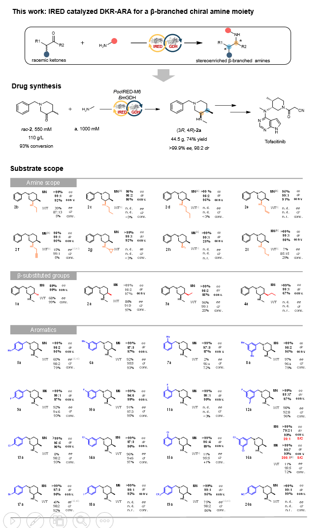 针对上述关键问题,该工作通过分子改造创制了一种高性能的亚胺还原酶,并成功用于连续立体中心的精准构筑,实现了一系列双手性β-取代胺的高效酶促合成。该成果不仅为手性胺连续立体中心的精准构筑提供了一种新方法,也为托法替尼药物关键手性中间体的合成提供了绿色高效的生物催化新工艺。