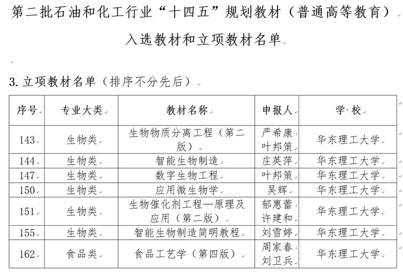 日前,第二批石油和化工行业“十四五”规划教材(普通高等教育)入选教材和立项教材名单公布,全校各类入选教材共21项,beat365平台唯一官网7项教材榜上有名。其中,生物类6项,食品类1项。