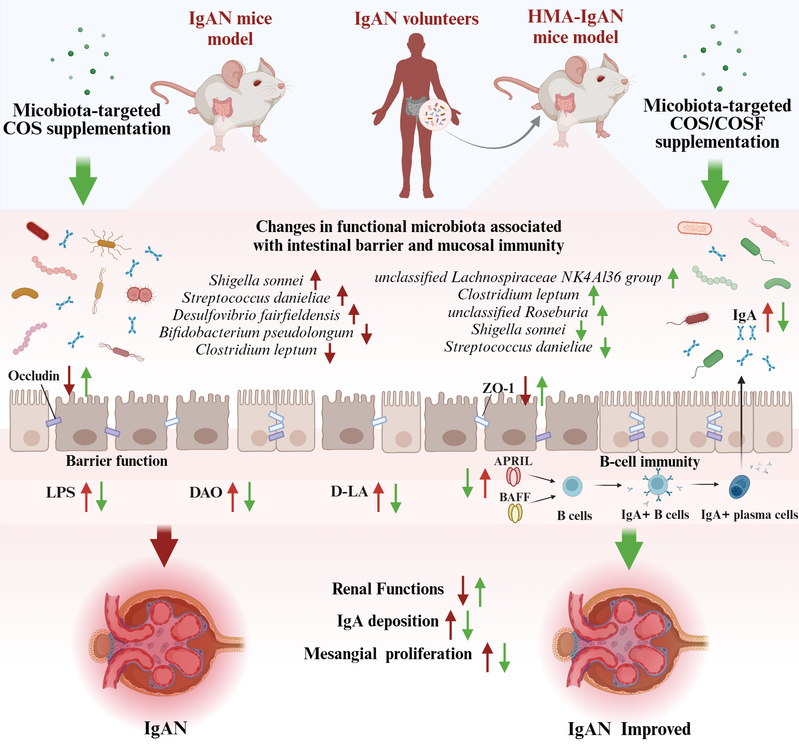 IgA肾病(IgAN)是世界范围内最常见的一种由免疫介导的原发性肾小球肾炎,与肠道菌群的稳态有关。本研究通过构建IgA肾病动物模型以及人类微生物群相关(Human microbiota-associated, HMA)的IgA肾病动物模型,揭示了特定类别功能菌群的变化对IgA肾病的影响,以Shigella sonnei, Streptococcusdanieliae, Desulfovibriofairfieldensis相对丰度的显著增加,和Bifidobacterium pseudolongum, Clostridium leptum相对丰度的显著减少为主要特征,明确了IgA肾病的发生发展与肠道菌群紊乱的相关性;进一步发现壳寡糖通过靶向与肠道屏障和黏膜免疫相关的功能菌群的调节,恢复了模型小鼠肠道菌群的α多样性,减轻了肠道屏障损伤和肠道B细胞过度激活,最终减缓了IgA肾病的肾功能损伤。本研究为微生物群靶向干预来改善IgA肾病提供了重要科学依据。