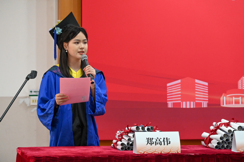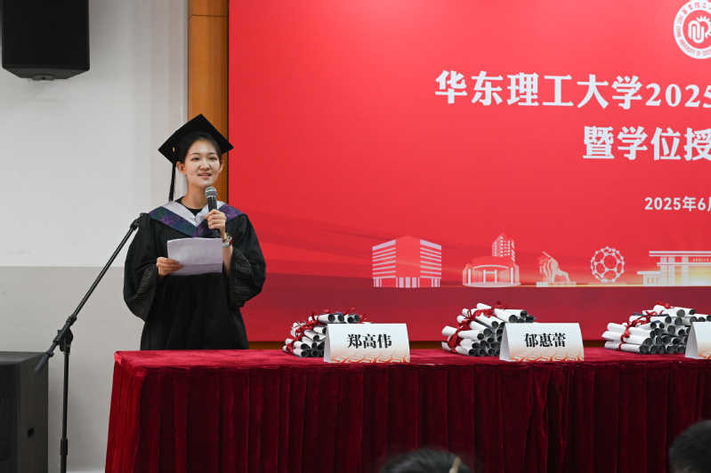 2025届食品科学与工程专业硕士研究生张茜代表研究生发言,在华理滋养与生工基因的培育下,她心怀热忱,积极服务社会;追求真理,将知识应用于疾病诊断。她呼吁同学们,无论身处何方,都要始终牢记母校给我们的底气,并在各自领域彰显生工人的力量。同时深情表达了对母校和老师们由衷的感谢以及对同窗们真诚的祝福。