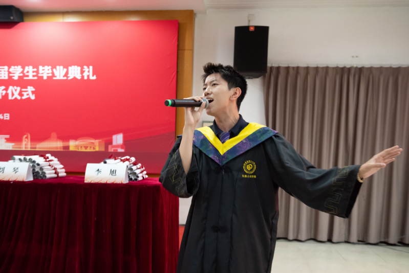 毕业典礼上,毕业生卢文升、张永杰深情献唱,道出与母校、同学们的不舍与祝愿。在悠扬的歌声中,beat365平台唯一官网毕业典礼圆满结束。