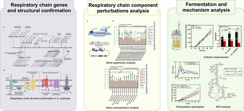 红霉素是最具有代表的14元环大环内酯类抗生素,同时也是多种大环内酯类抗生素化学修饰的原料,在医疗保健领域具有广泛应用。红霉素的主要生产者为红色糖多孢菌,目前工业合成红霉素主要以复合培养基进行,但是存在不利于发酵精准调控、下游处理复杂等问题。为实现红霉素的绿色生物制造,团队使用CDM对红霉素生产进行了深入研究。针对红霉素合成过程中ATP需求高的特点,研究团队对红色糖多孢菌电子传递链的结构和功能进行详细解析,通过对各组分表达增强或抑制,明确了NADH脱氢酶和末端氧化酶对于菌体能量代谢的关键作用。通过对bd型末端氧化酶的过表达,实现了对胞内NADH/NAD+比例的调控,提升了胞内ATP含量,在摇瓶水平产量提升了26.5%。通过发酵优化,在5 L生物反应器中利用CDM获得了2400 mg/L的红霉素产量,表明了该菌种的潜在工业价值。该研究表明,呼吸链工程是优化氧化还原平衡和提高工业抗生素产量的有效策略。