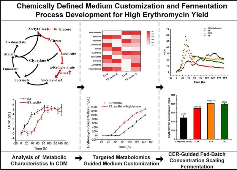 工程菌株E3::sucBA 虽具红霉素合成增强潜力,但在CDM中生长迟缓致产能受限。团队采用同位素稀释质谱法(IDMS)对 E3::sucBA 菌株与出发菌株 E3 进行靶向代谢组学对比分析,发现胞内谷氨酸匮乏是氮源利用低效、生长迟缓的核心瓶颈。定向添加 0.5 g/L 谷氨酸后,菌株生长迟缓改善,红霉素产量从 930.1 mg/L 升至 1307.9 mg/L,实现生长与产素的协同改善。在此基础上,团队进一步突破传统工艺瓶颈,开发以二氧化碳释放率(CER)为核心监测指标的动态补料倍增发酵策略,规避了高初始底物浓度对菌株生长的抑制作用,该策略使红霉素产量达 4065.79 mg/L,细胞干重(CDW)最高提升至 18.4 g/L,较原始 CDM 培养条件提高3倍以上。此外,添加维生素与辅因子后,产量进一步提升至 4800 mg/L(CDM体系最高)。该研究为放线菌来源抗生素的培养基定制优化与发酵工艺开发提供了新的范式,也将为抗生素绿色高效工业化生产提供技术参考。