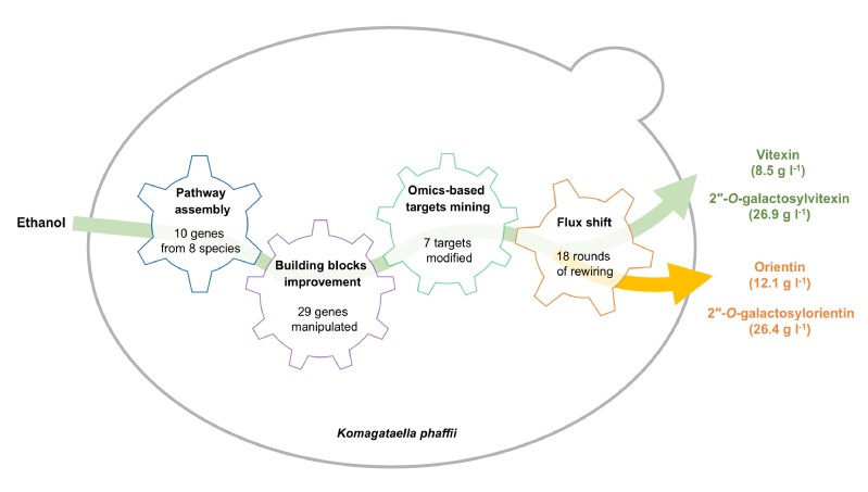 研究团队首先设计了高效的“杂合”途径,从植物、酵母及细菌等8个物种中优选了10种高特异性、高活性的酶(基因)元件,在酵母中“协同作战”,成功实现上述4种黄酮苷的从头合成。随后,通过“分而治之、各个击破”策略,对三种前体砌块分层改造,解决其胞内供应不足、比例失衡瓶颈,对内外源基因开展29次编辑与操控,成功实现牡荆素及2″-O-牡荆素半乳糖苷分子的高效合成。