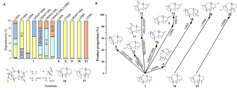 面对天然紫杉烷氧化酶的技术局限,研究团队另辟蹊径,寻找非天然的紫杉烷氧化酶替代方案。研究团队从29 种真菌来源的过氧化物酶和过加氧酶中进行了筛选,最终发现来自太瑞斯梭孢壳霉(学名:Thielavia terrestris)的非特异性过加氧酶TteUPO对紫杉二烯具有最高的氧化活性和优异的蛋白表达水平,这也是首次发现对紫杉烷具有氧化活性的非天然氧化酶。研究团队解析了 TteUPO 的晶体结构,通过重塑该酶的底物通道,成功实现催化效率的提高和氧化位点的拓展。研究成功构建了一个包含7个关键突变体的氧化酶工具箱,能够对紫杉烷骨架的6个不同位点实现高区域和立体选择性的氧化。该氧化酶工具箱不仅对紫杉二烯具有良好催化效果,对多种氧化态更高的紫杉烷衍生物同样表现出优异的催化性能。这项研究不仅为解决紫杉醇下游修饰难题提供了丰富的酶工具箱,更为紫杉醇等复杂天然产物的绿色生物合成开辟了全新路线。
