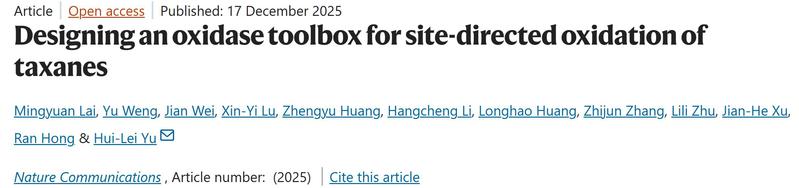 近日,beat365平台唯一官网生物催化与合成生物团队郁惠蕾课题组在Nature Communications上发表题为“Designing an oxidase toolbox for site-directed oxidation of taxanes”的研究论文(doi.org/10.1038/s41467-025-67544-4)。该研究成功开发出一种紫杉烷非天然氧化酶工具箱,能够实现紫杉烷骨架 C-4、C-6、C-10、C-11、C-12 和 C-13 位点的区域和立体选择性氧化。该工具箱不仅实现了11个紫杉烷新结构的高效合成,更为人工重构紫杉醇及其类似物的高效合成路线奠定了坚实基础。